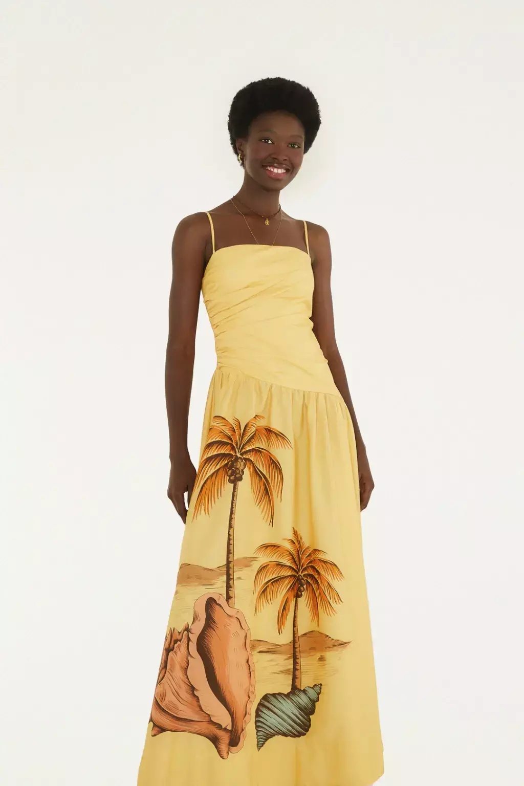 Com alças, drapeado, godê e com linda estampa que se harmoniza com a cor vibrante.